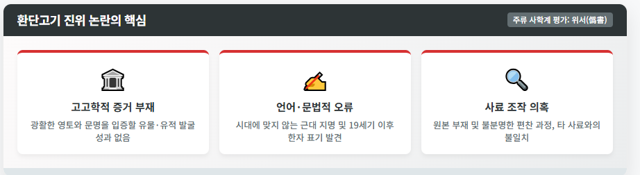 이처럼 환단고기의 내용은 매우 파격적이고 흥미롭습니다. 하지만 주류 역사학계의 입장은 매우 비판적이며, 대부분 '위서'로 평가합니다. 왜 이런 극명한 입장 차이가 발생하는 걸까요?