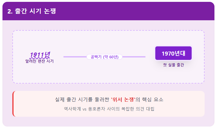 책 자체는 1911년에 편찬되었다고 알려져 있지만, 실물로 처음 출간된 것은 해방 이후 1970년대입니다. 이 '실제 출간 시기'를 두고도 역사학계와 옹호론자들 사이에 의견이 분분하며, 이 점이 환단고기의 진위 논쟁을 더욱 복잡하게 만드는 요소 중 하나입니다.