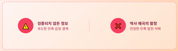 - 배타적 민족주의와 국수주의: '환빠' 현상이 건강한 민족 정서보다는 극단적인 배타적 민족주의나 국수주의로 흐를 위험이 있다고 우려합니다. 다른 민족의 역사를 폄하하거나, 역사적 진실보다 민족적 감정을 우선시하여 사회 통합을 저해할 수 있다는 지적입니다.