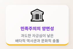 역사는 민족의 정체성을 형성하는 중요한 요소이지만, 이를 다루는 방식에 따라 그 영향은 긍정적일 수도, 부정적일 수도 있음을 보여주는 사례입니다.