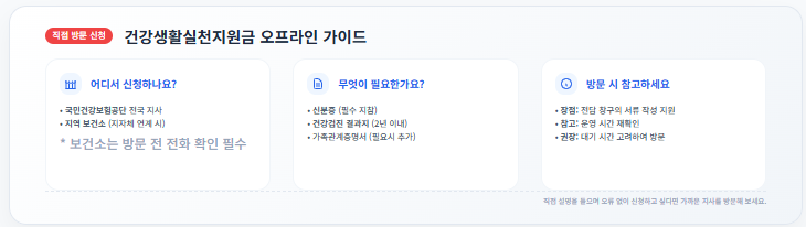 온라인 신청이 익숙하지 않거나, 대면 상담을 통해 궁금증을 해소하고 싶은 분들은 직접 방문하여 신청할 수도 있습니다. 가까운 국민건강보험공단 지사 또는 보건소를 방문해 보세요.