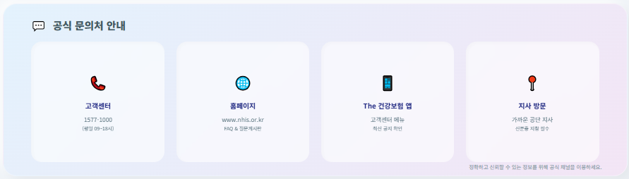 - 국민건강보험공단 고객센터: 1577-1000 (평일 09:00 ~ 18:00)