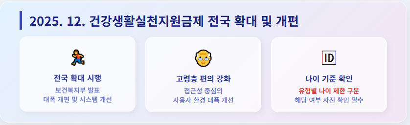 보건복지부의 발표에 따르면 2025년 12월부터 '걷기·건강교육 지원금'(건강생활실천지원금제)이 전국적으로 대폭 개편 및 확대 시행됩니다.