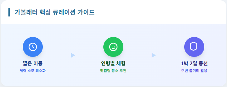 가볼래터에서는 연령대별로 가기 좋은 장소를 큐레이션해 주므로, 뉴스레터 하단의 '주변 볼거리' 정보를 활용해 1박 2일 동선을 짜면 훨씬 수월합니다.