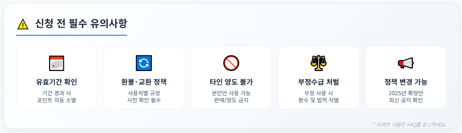 - **부정 수급 시 처벌:** 거짓이나 부정한 방법으로 지원금을 받거나 사용한 경우, 환수 조치 및 법적 처벌을 받을 수 있습니다.