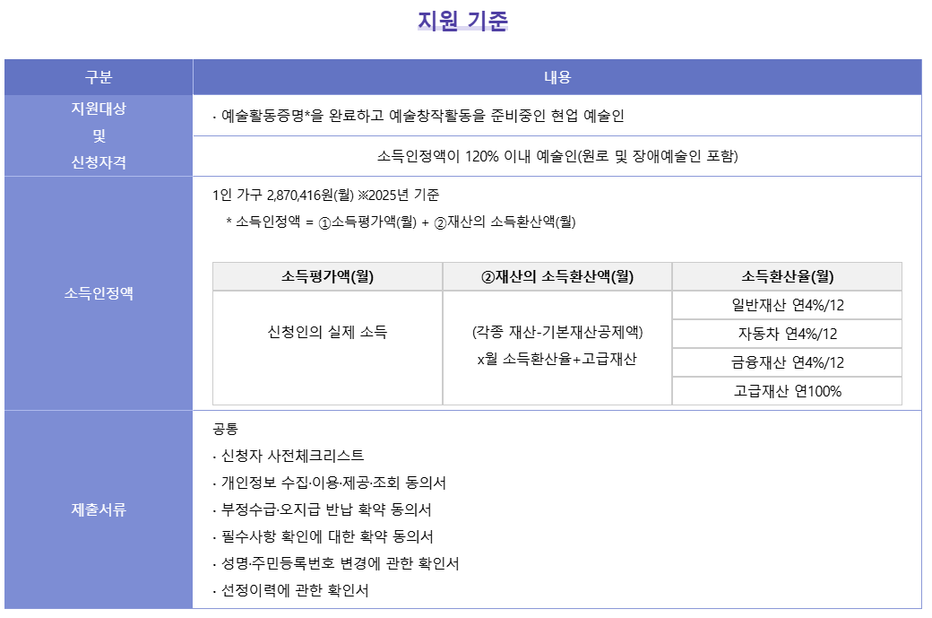 · 소득인정액이 당해 연도 기준 중위소득 120% (2,870,416원) 이내인 예술인