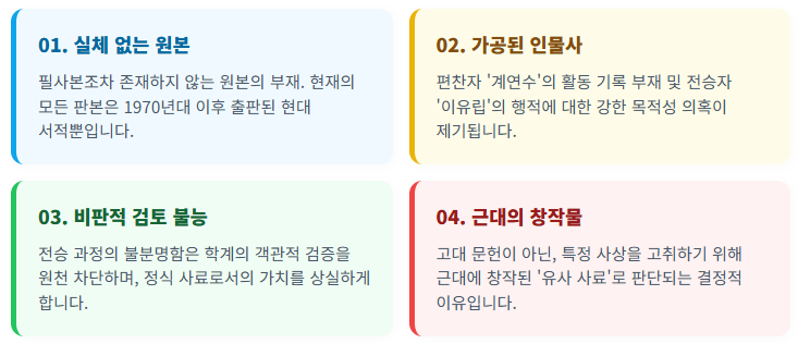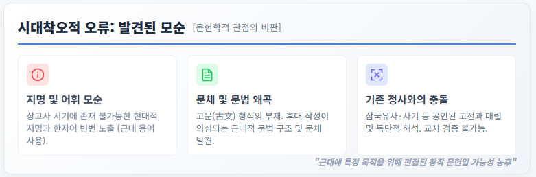 여기서 '위서'라는 평가는 단순히 내용의 옳고 그름을 넘어, '역사적 사료로서의 가치가 없다'는 강한 부정을 내포하고 있습니다. 그 배경에는 몇 가지 핵심적인 논리적, 학문적 근거가 존재합니다.