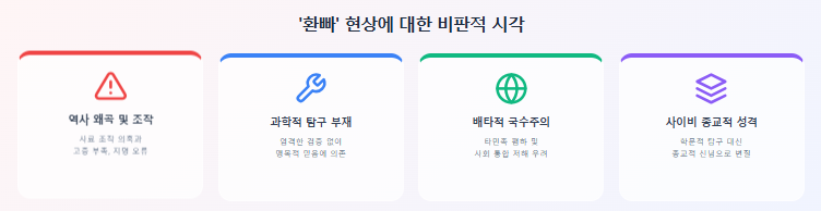 - 사이비 종교적 성격: 일부 '환빠' 현상에서는 특정 종교나 신념 체계와 결부되어, 역사적 탐구보다는 종교적 신념을 강화하는 방식으로 변질되는 경향도 있어 우려를 낳고 있습니다.