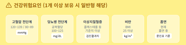 일반형 지원금을 신청하시는 분들은 다음 건강위험요인 중 1개 이상을 보유하고 계셔야 합니다.