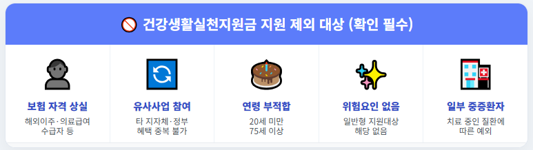 - **타 건강지원 사업 중복 참여자:** 이미 유사한 정부 또는 지자체 건강지원 사업에 참여하여 혜택을 받고 있는 경우 (중복 수혜 방지 원칙)