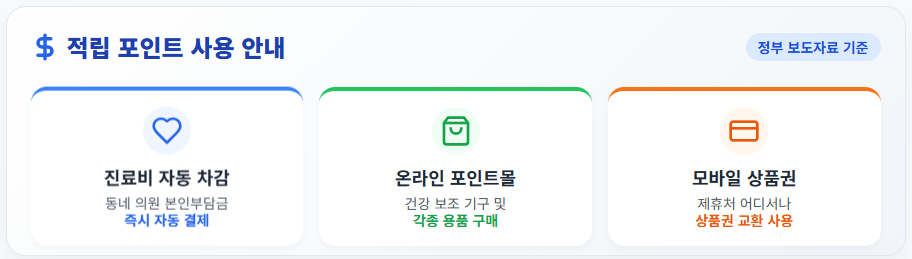 - 진료비 자동 차감: 전국 동네 의원에서 진료비 본인부담금을 포인트로 즉시 자동 결제
