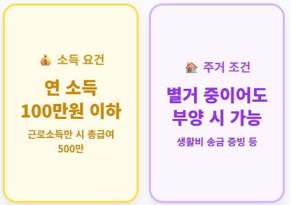 - **소득 요건**: 연간 소득금액이 100만원 이하 (단, 근로소득만 있는 경우 총 급여 500만원 이하)여야 합니다.