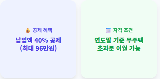 - **공제 금액**: 연간 납입액(최대 240만원)의 40% (최대 96만원)를 소득공제합니다.