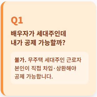 A1: 아니요. 주택임차차입금 원리금 상환액 소득공제는 '무주택 세대주'인 근로자 본인이 직접 대출을 차입하여 상환한 경우에만 공제받을 수 있습니다. 배우자가 세대주라면 배우자가 공제 요건을 충족해야 합니다.