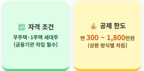 - **조건**: 과세연도 종료일 현재 세대주인 무주택 또는 1주택 보유 세대주 (차입 시 무주택 요건 필요). 금융기관 또는 주택도시기금으로부터 차입한 대출이어야 합니다.