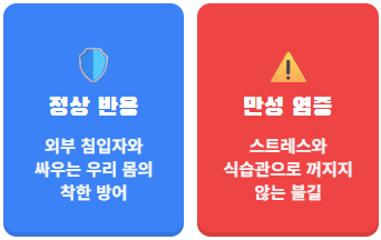우리 몸의 염증 반응은 외부 침입자와 싸울 때 나타나는 지극히 정상적인 과정입니다. 하지만 스트레스, 가공식품, 운동 부족으로 인해 이 염증이 꺼지지 않고 지속되면 '만성 염증(Chronic Inflammation)' 상태가 됩니다.