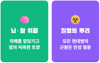 만성 염증은 혈관 벽을 공격해 동맥경화를 일으키고, 뇌세포를 파괴해 치매를 유발하며, 암세포의 성장을 돕는 비옥한 토양이 됩니다. "모든 현대병의 뿌리는 만성 염증에 있다"는 말이 나오는 과학적 근거가 바로 여기에 있습니다.