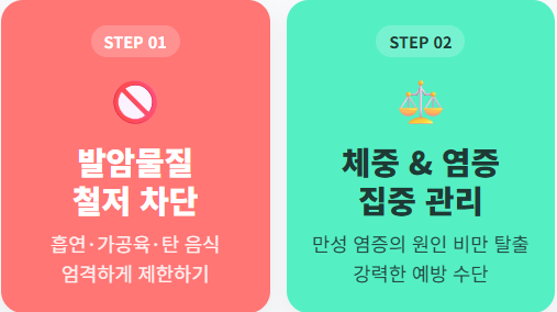 - 발암물질 차단: 가족력이 있는 암과 관련된 위험 요인(흡연, 가공육, 탄 음식 등)을 일반인보다 훨씬 엄격하게 제한해야 합니다.