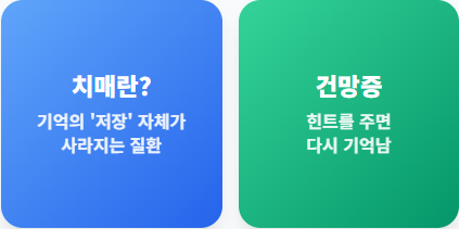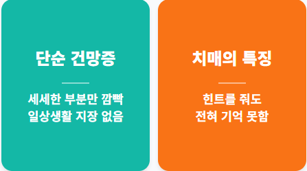 단순 건망증과 치매를 구분하는 가장 쉬운 방법은 '힌트'입니다. 건망증은 정보가 뇌 어딘가에 저장되어 있어 실마리를 주면 다시 떠올리지만, 치매는 정보 입력 자체가 실패한 상태라 전혀 기억해내지 못합니다.