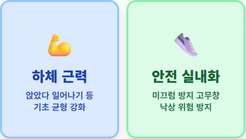 - 하체 근력 강화: 앉았다 일어나기 등 가벼운 근력 운동은 균형 감각을 유지하는 데 필수입니다.