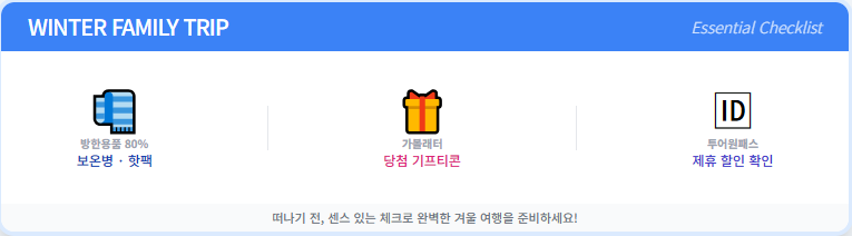 겨울 가족 여행은 방한 용품이 80%입니다. 보온병, 핫팩은 기본이고 가볼래터 이벤트로 당첨된 기프티콘을 챙겨가는 재미도 쏠쏠하죠.