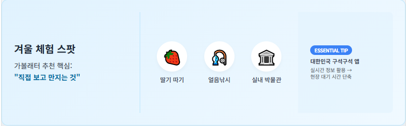 딸기 따기 체험, 얼음낚시, 혹은 실내 박물관 견학 코스를 뉴스레터에서 골라보세요. 특히 **대한민국 구석구석 앱**의 실시간 정보를 활용하면 현장 대기 시간도 줄일 수 있습니다.