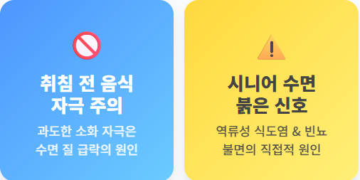 특히 시니어의 경우 역류성 식도염이나 빈뇨 증상이 불면으로 이어지기 쉬우므로 저녁 식단 관리가 무엇보다 중요합니다.