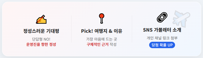 운영진에게 정성을 보여주는 것이 중요합니다. 개인 SNS에 가볼래터를 소개하고 그 링크를 첨부하면 당첨권에 더 가까워집니다.