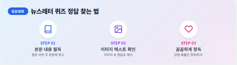 정답은 항상 그 주의 뉴스레터 본문 내용에 명시되어 있습니다. 이미지 속에 텍스트로 적힌 경우도 많으니 놓치지 마세요. 꼼꼼히 읽는 것이 곧 당첨 확률과 직결됩니다.