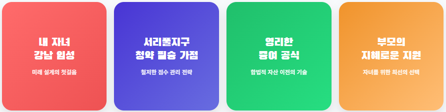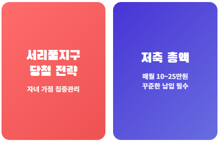 서리풀지구는 공공분양 물량이 많아 **'저축 총액'** 혹은 **'가점제'**가 당첨의 성패를 가릅니다. 특히 신혼부부 및 청년 특별공급 비중이 높기 때문에 자녀의 상황에 맞는 전략이 필요합니다.
