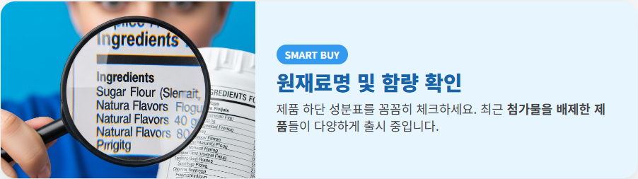 최근에는 이러한 첨가물을 배제한 '무부형제' 제품들도 많이 출시되고 있으니 성분표 하단의 '원재료명 및 함량'을 꼼꼼히 살펴보세요.