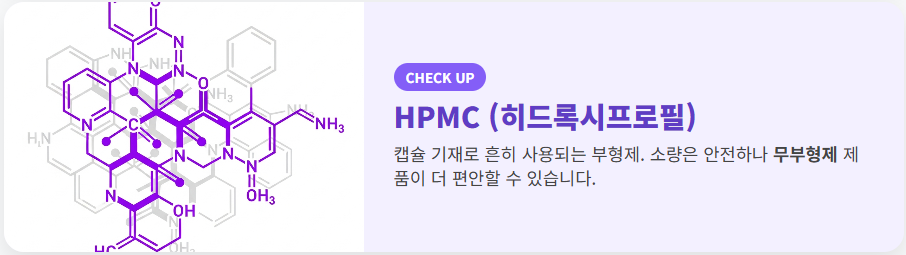 캡슐을 만들거나 알약의 형태를 유지하기 위해 사용되는 이산화규소, 스테아린산마그네슘, HPMC 등은 소량 섭취 시 안전하지만, 민감한 분들에게는 위장 장애를 일으킬 수 있습니다.