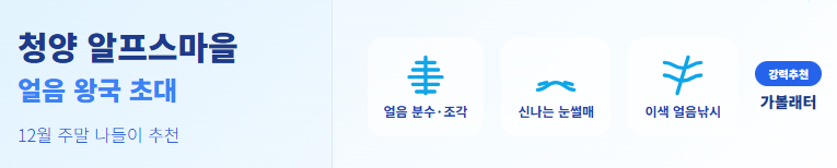거대한 얼음 분수와 눈 조각이 가득한 청양 알프스마을입니다.