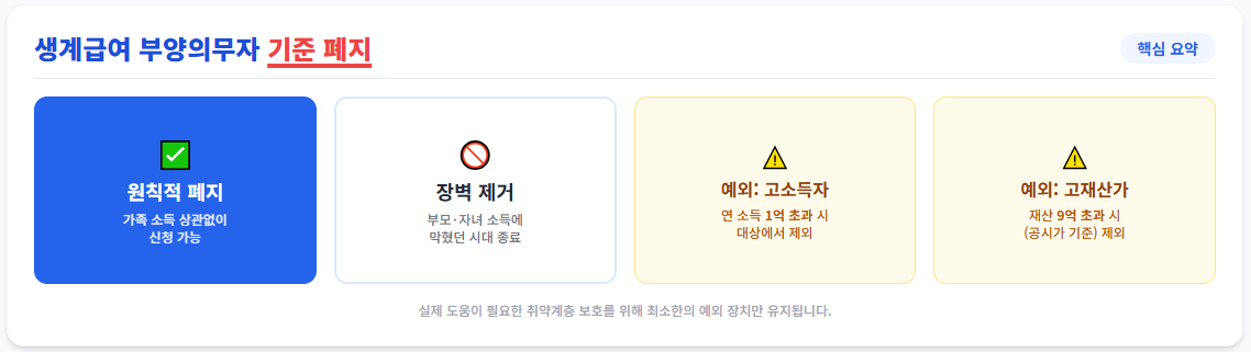 단, 예외 사항이 존재합니다. 부양의무자(부모 또는 자녀) 가구가 연 소득 1억 원 또는 재산 9억 원(공시가격 기준)을 초과하는 고소득/고재산가일 경우에는 여전히 수급 대상에서 제외될 수 있습니다. 이는 정말 도움이 필요한 분들에게 혜택을 집중하기 위한 최소한의 장치입니다.