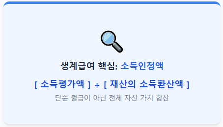 생계급여 수급 자격을 결정짓는 가장 중요한 지표는 '소득인정액'입니다. 많은 분들이 본인이 버는 월급만 생각하시지만, 실제로는 [소득평가액 + 재산의 소득환산액]을 합산한 금액으로 평가받습니다.