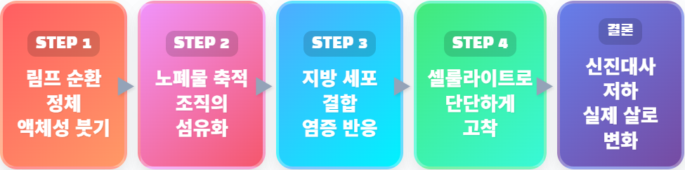 림프 순환이 원활하지 않으면 체내 노폐물이 배출되지 못하고 지방 세포 주변에 쌓이게 됩니다. 이것이 시간이 흐르며 딱딱하게 굳어지면 이른바 '셀룰라이트'가 되거나 실제 체중 증가로 이어지는 것입니다. 특히 신진대사가 떨어지는 시니어기에는 림프의 펌핑 능력이 낮아지므로 인위적인 자극이 반드시 필요합니다.