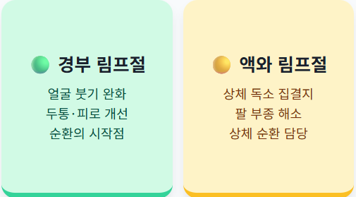 - 겨드랑이(액와 림프절): 상체의 독소가 모이는 곳으로, 팔의 부종과 상체 순환을 담당합니다.