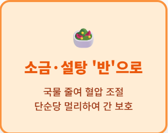 - 소금과 설탕 '반'으로 줄이기: 나트륨은 혈압을, 단순당은 지방간을 만듭니다. 국물 섭취만 줄여도 혈압 수치는 즉각 반응합니다.