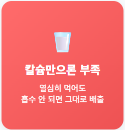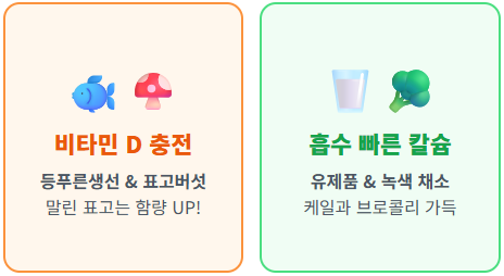 - ✅ 칼슘: 하루 800~1,000mg 섭취 권장 (식사로 부족할 시 보충제 고려)