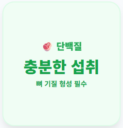 - ✅ 단백질: 뼈의 기질을 형성하기 위해 충분한 단백질 섭취가 병행되어야 함