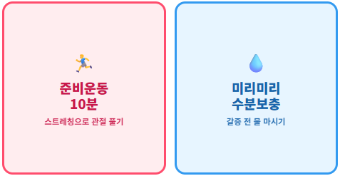 - 충분한 수분 섭취: 야외 활동 중 갈증을 느끼기 전 미리 물을 마시는 것이 중요합니다.