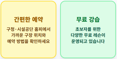 가까운 구청이나 지역 체육시설관리공단 홈페이지에서 거주지 근처 파크골프장 위치와 예약 방법을 확인해 보세요. 초보자를 위한 무료 강습 프로그램도 많이 운영되고 있습니다.