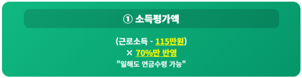 근로소득에서 기본 공제액(2026년 기준 약 115만 원 예상)을 뺀 금액의 70%만 반영합니다. 즉, 일해서 버는 돈은 상당히 많이 깎아주므로 일을 하셔도 연금을 받을 가능성이 충분합니다.