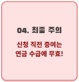 증여한 날로부터 소득 환산율만큼 차감하며 자연 소멸될 때까지(보통 수년) 본인의 재산으로 잡힙니다. 따라서 신청 직전에 증여하는 것은 연금 수급에 전혀 도움이 되지 않습니다.