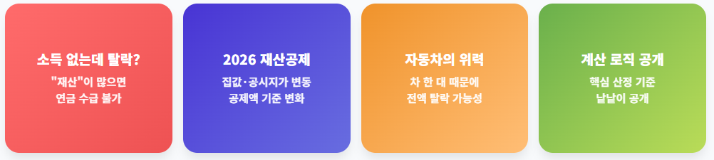 기초연금을 신청할 때 가장 당혹스러운 순간은 "소득은 없는데 재산이 많아서 안 됩니다"라는 답변을 들을 때입니다. 2026년 기준으로는 집값 상승과 공시지가 변동에 따라 재산 공제액에도 변화가 생겼습니다. 특히 가지고 계신 자동차 한 대 때문에 연금이 전액 탈락할 수도 있다는 사실, 알고 계셨나요? 오늘 그 구체적인 계산 로직을 낱낱이 공개합니다.