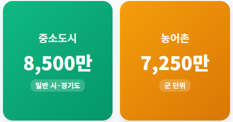 | 중소도시 (일반 시) | 8,500만 원 | 경기도 및 지방 도시 |