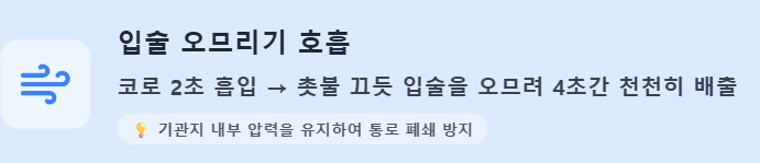 - 입술 오므리기 호흡(Pursed-lip Breathing): 코로 2초간 숨을 들이마시고, 촛불을 끄듯 입술을 오므려 4초간 천천히 내뱉습니다. 기관지 내 압력을 높여 통로가 폐쇄되는 것을 막아줍니다.