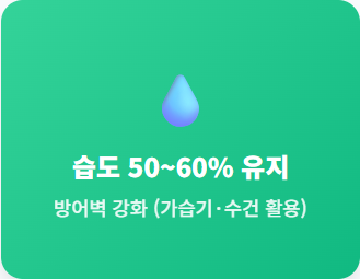- 실내 습도 50~60% 유지: 건조한 공기는 기관지 방어벽을 무너뜨립니다. 가습기나 젖은 수건을 활용하세요.