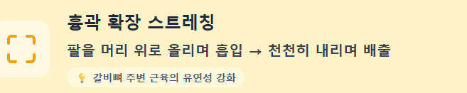 - 흉곽 확장 스트레칭: 양팔을 머리 위로 올리며 숨을 마시고, 천천히 내리며 숨을 내뱉습니다. 굳어 있는 갈비뼈 주변 근육을 유연하게 만듭니다.