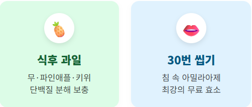 - 과일 효소 활용: 단백질 분해를 돕는 무(디아스타아제), 파인애플(브로멜라인), 키위(액티니딘)를 식후에 소량 섭취하세요.